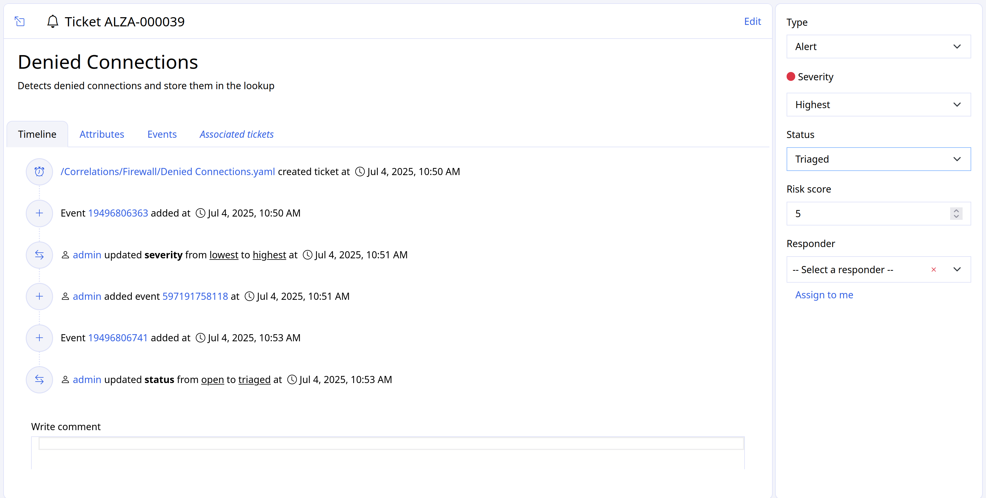 Časová osa zaznamenává všechny relevantní změny v tiketu, jako jsou fáze životního cyklu tiketu, změny odpovědných osob, relevantní komentáře uživatelů atd.