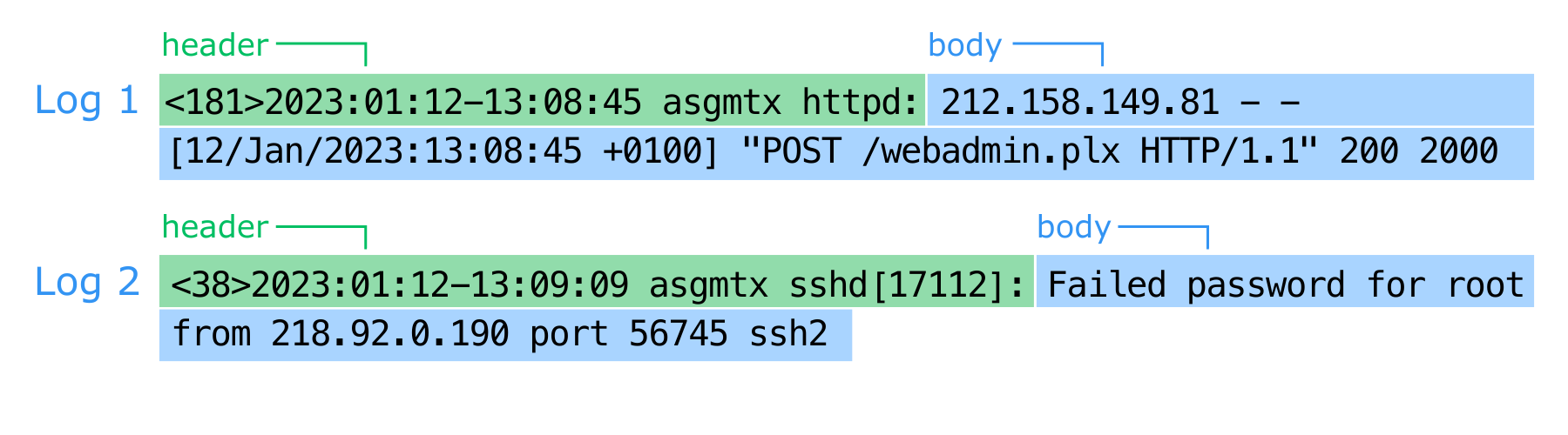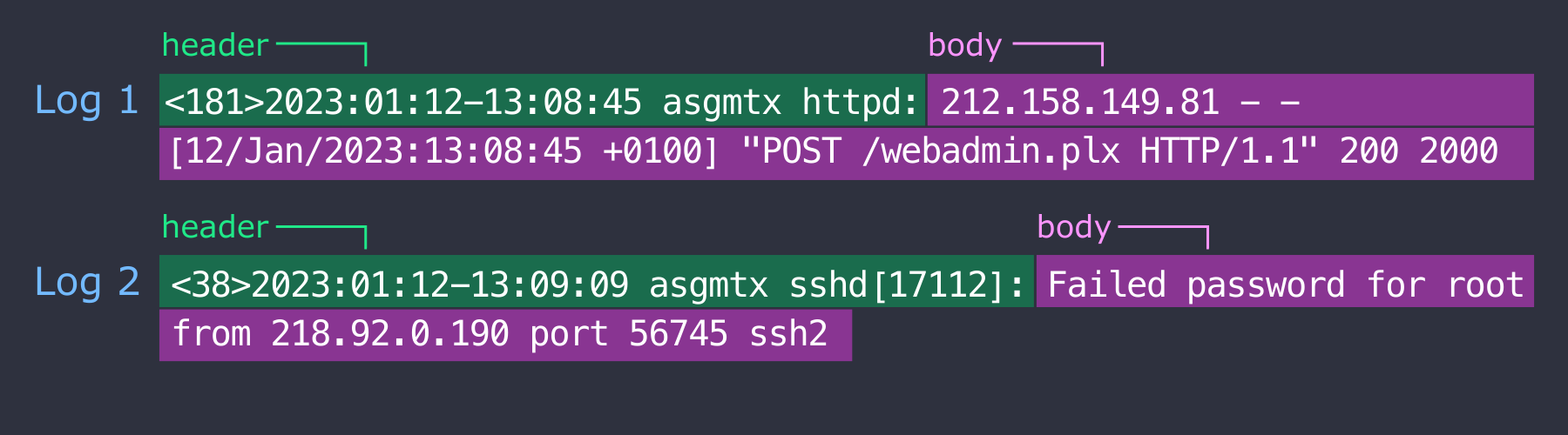 Logy lze obvykle rozdělit na dvě části: hlavičku a tělo. Hlavička je cokoli, co předchází prvnímu dvojtečce po časovém razítku. Tělo je zbytek logu.