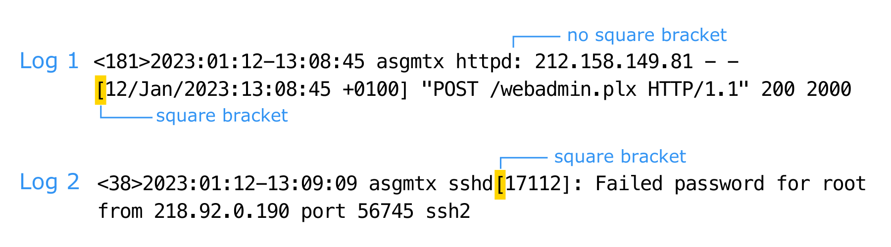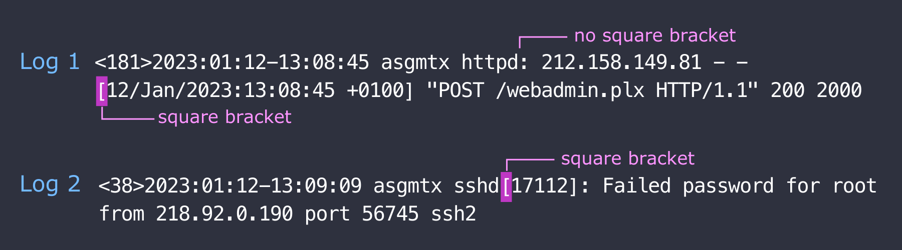 Abychom vyřešili problém, že první log nemá PID procesu, potřebujete druhou deklaraci parseru, subparser. V ostatních logech je PID procesu uzavřen v hranatých závorkách ([ ]