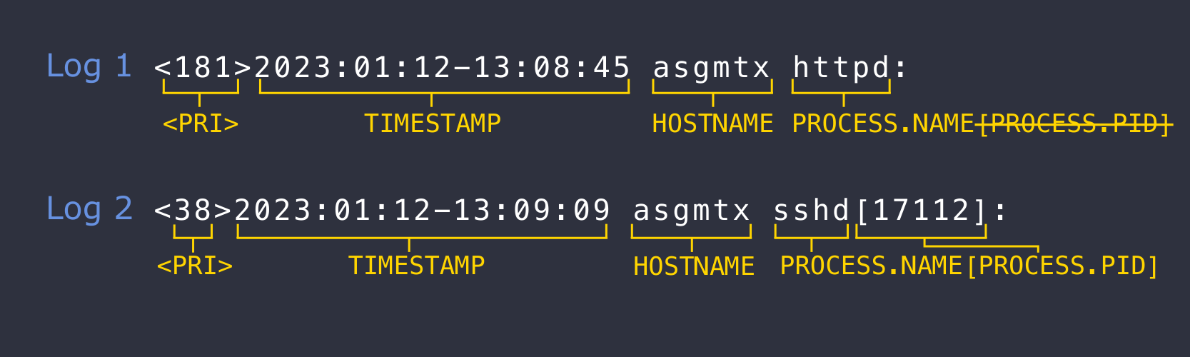 v hranatých závorkách není přítomen v hlavičce prvního logu. Abychom vyřešili tuto nesrovnalost, parser bude potřebovat způsob, jak se vypořádat s možností, že PROCESS.PID